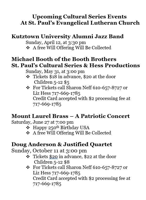Members of the Cultural Series Team bring glory to God by bringing a variety of talent to St. Paul’s Lutheran Church. Through these programs we hope to form spiritual friendships in our congregation, community, and beyond.